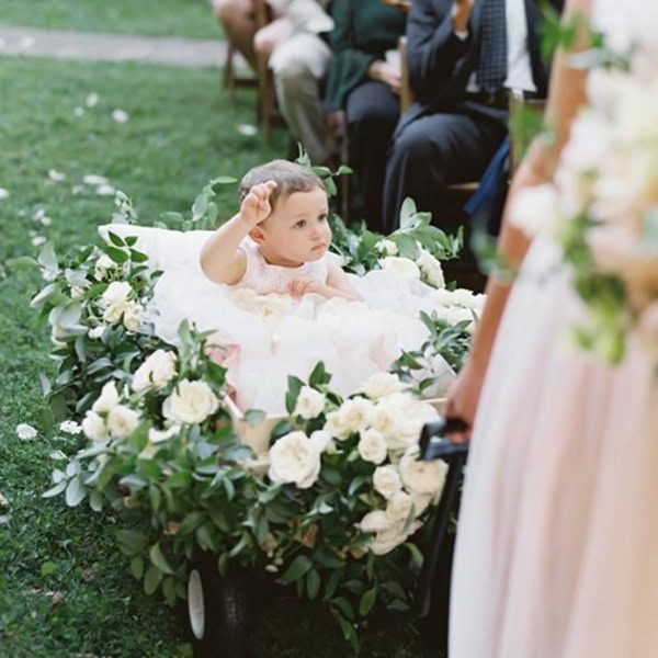 Is your flower girl not old enough to walk? Put her in a decorated wagon!
