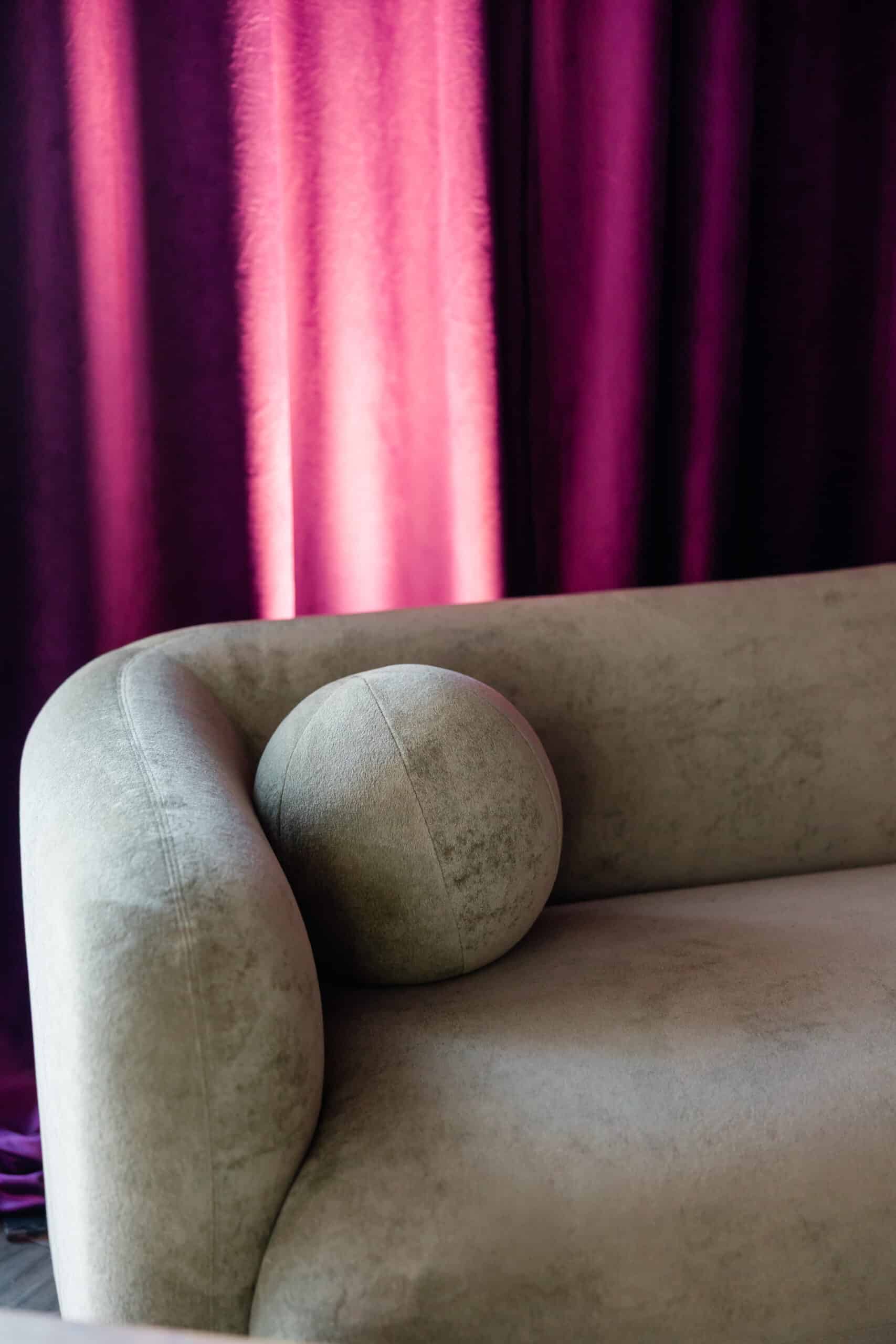 This 3 seater sofa is a sculptural statement piece upholstered in rich Thyme color fabric. Its bold, tubular silhouette features oversized rounded arms.
